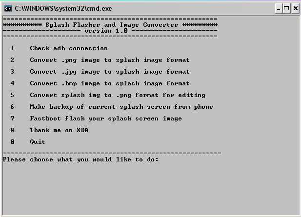 Unzip the SplashFlasher Utility to the location of choice. Place the PNG file you just made into the “place-image-here’ folder and click the “CLICK-HERE.bat”. Notice this useful utility pops up 😉
